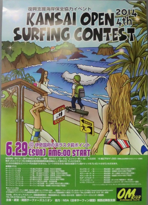 2011・3・11の衝撃を忘れることなく、今現在波乗りができる環境があることに感謝し この国府の浜を愛するすべての方のエネルギーが一つにまとまるためのイベントとして 関西オープンは継続していかなければならないと感じております。 また、来年も同じ時期に第5回目を予定していますので、 エントリー告知・受付 / ボランティアスタッフ募集・派遣 / 活動運営費寄付など、 上手いも下手も、今も昔も関係なく、波乗りに関係するすべての皆様からのさらなるご協力をよろしくお願い致します。 |