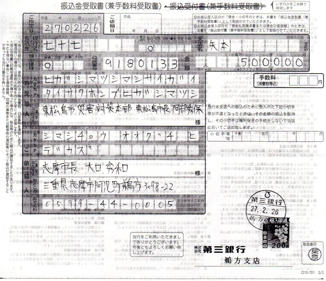 2015年2月26日報告:遅くなりましたが、大口志摩市長から 気仙沼市に¥500,000と東松島市に¥500,000を復興支援金として寄付送金して頂きました。 残金¥521,000は波乗りを楽しむための海岸保全協力のために使っていきますが とりあえず、関西サーファーズユニオンで管理させて頂きます。 |