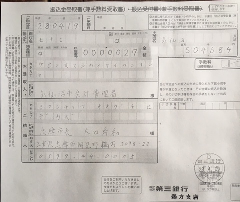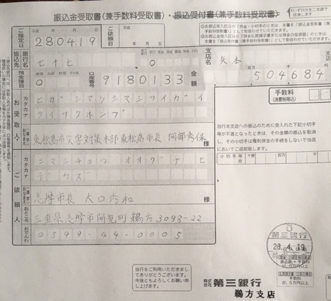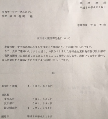 2016年4月25日報告:遅くなりましたが、大口志摩市長から 気仙沼市に¥504,684と東松島市に¥504,684を復興支援金として寄付送金して頂きました。 残金¥537,000は波乗りを楽しむための海岸保全協力のために使っていきますが とりあえず、関西サーファーズユニオンで保管させて頂きます。 |