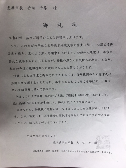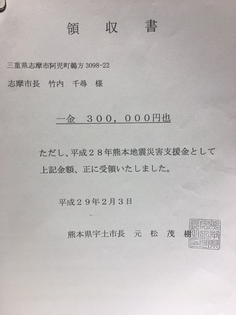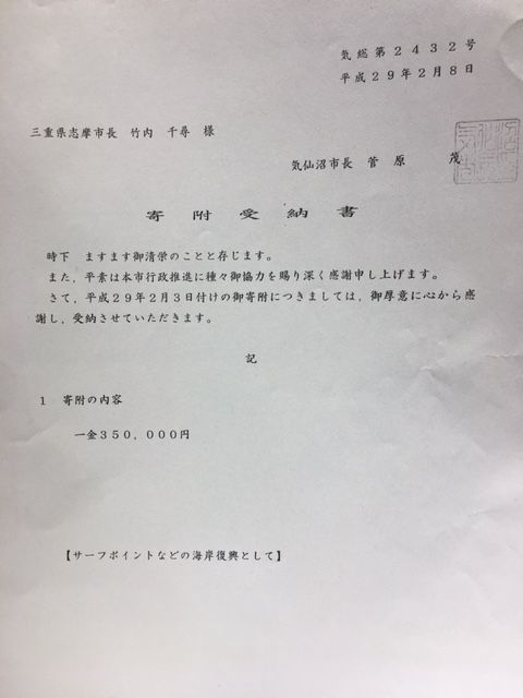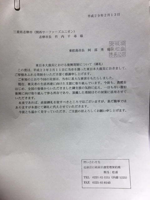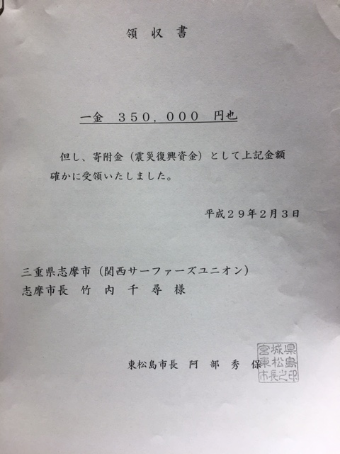 2017年2月14日報告:遅くなりましたが、竹内志摩市長から 気仙沼市に¥350,000と東松島市に¥350,000、熊本県宇土市へ¥300,000の 計¥1,000,000を復興支援金として寄付送金して頂きました。 残金¥319,000は波乗りを楽しむための海岸保全協力のために使っていきますが とりあえず、関西サーファーズユニオンで保管させて頂きます。 |