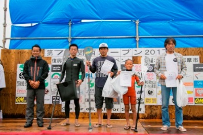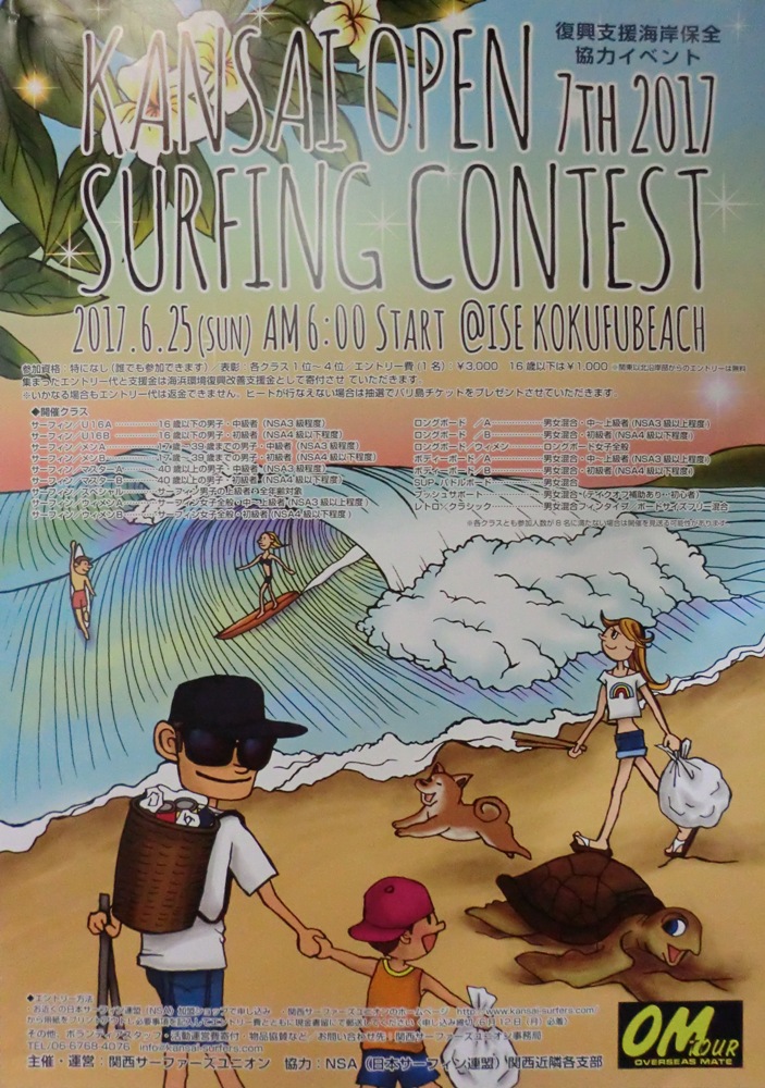 復興支援海岸保全協力イベント 第7回関西オープン 2017年6月25日(日) 伊勢志摩・国府の浜 主催・運営:関西サーファーズユニオン 協力:NSA(日本サーフィン連盟)関西近隣各支部 後援:三重県 / 志摩市 第7回の開催報告と御礼.pdf ありがとうございました。第7回関西オープンも無事終了いたしました。 エントリー協力してくださった皆さん:384名 (エントリー協力者384名.pdf) ボランティアスタッフ協力してくださった皆さん:71名 (ボランティアスタッフ協力71名.pdf) 運営費寄付協力:63口、物品協賛:14社 (活動運営費寄付協力63口と物品協賛.pdf) この皆さんの協力により 今回もエントリー代で預かった金額:¥984,000と 大会当日の募金:¥7,952との合計¥991,952を 復興支援海岸保全協力金として志摩市を通して寄付させて頂きます。 振り分けについてご意見・ご提案などございましたらお伝えください。 2018年3月5日・復興支援金を竹内志摩市長から被災地へ送金して頂きました。 →2017支援金送金報告 気仙沼市長、東松島市長からお礼の手紙も頂いてます。 早朝の雨降る中での準備から丸1日ジャッジとしての業務も しっかりやって頂いたショップ関係の皆様、特に感謝いたします。 このイベントが継続開催できてるのも皆さんの協力があってのことだと 深く感じております。感謝です。 今回も朝早くから志摩市長にもお越しいただき挨拶と激励のお言葉をいただきました。 私達の活動を見守ってくださってます。 このイベントを通して地元住民や行政の方々に私達の思いや願いがしっかり伝えられるよう そして、夢が現実になるよう活動努力していきますので これからもよろしくお願い致します。 写真提供:岡タカシ/zero.photograf lab by Tkashi Oka
