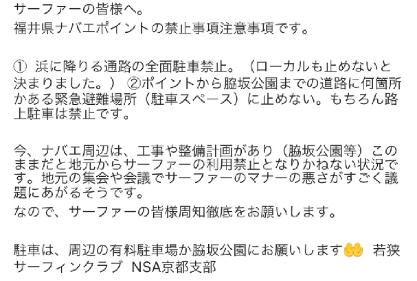 | 若狭サーフィングラブ NSA京都支部 からサーファーの駐車についてのお願い。'19/2/4 | ||||||||||||||